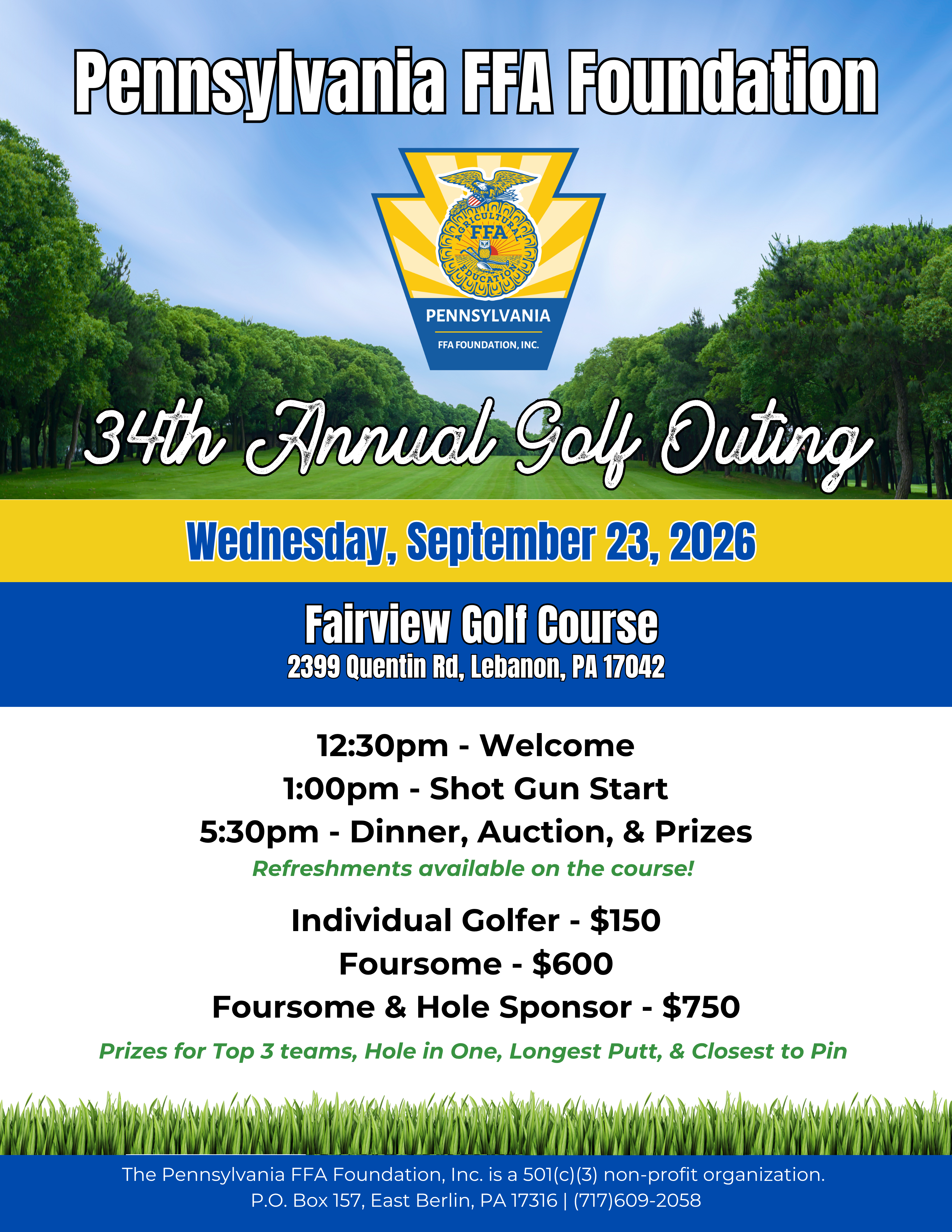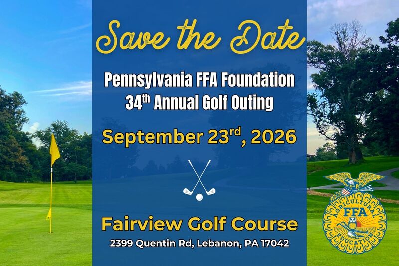 Mark your calendars for the 34th Annual Golf Outing on Wednesday, September 23, 2026, returning once again to Fairview Golf Course in Lebanon, PA. We look forward to another incredible day supporting the future of agriculture.